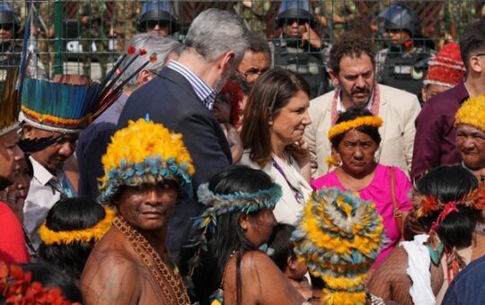 Brasilia, Brasil, América.- Decenas de manifestantes indígenas bloquearon este viernes el frente de la sede…