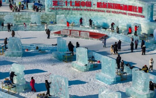Beijing, China, Asia.- Vista aérea tomada con un dron de competidores trabajando en esculturas de…