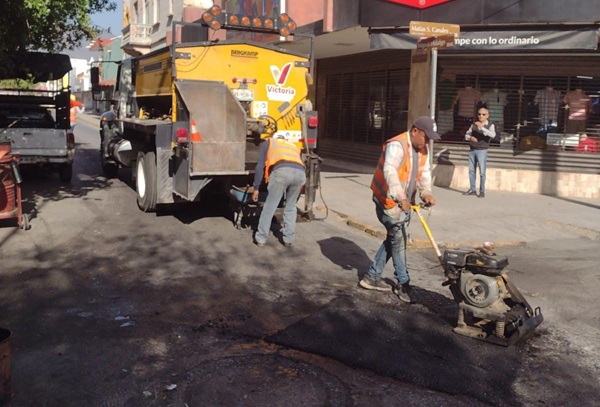 Ciudad Victoria, Tamaulipas, México, América.- Como parte del trabajo que realiza el Gobierno de Victoria para mejorar la imagen urbana de la ciudad, la Secretaría de Obras Públicas del Municipio intensificó este día trabajos de bacheo en calles de la zona centro.