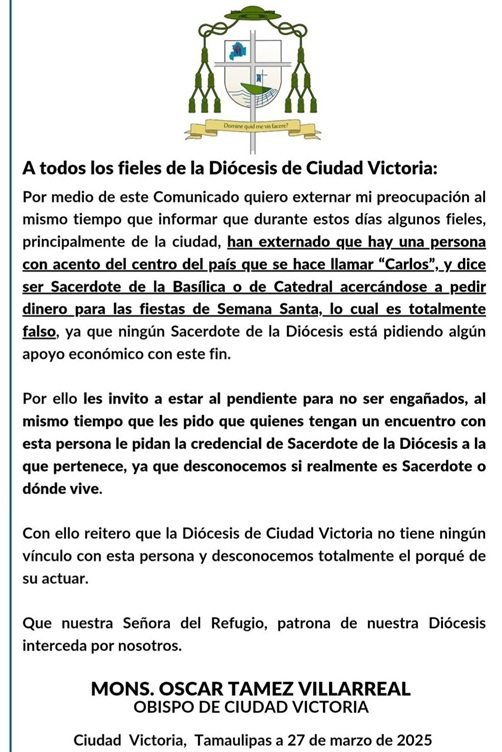 A través de un comunicado difundida en redes sociales, el obispo, monseñor Óscar Tamez Villarreal, informó que varios fieles han reportado la presencia de un hombre con acento del centro del país, quien se identifica como «Carlos» y asegura pertenecer a la Basílica o a la Catedral. Dicho sujeto, explica se acerca a las personas pidiendo dinero con el pretexto de apoyar las festividades de Semana Santa, lo cual, aseguró el obispo, es completamente falso.