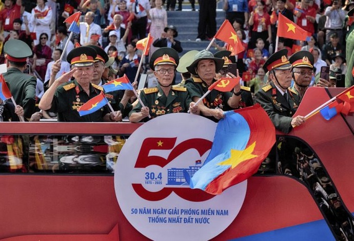 Tropas chinas, laosianas y camboyanas marcharon detrás de las formaciones del ejército vietnamita, incluyendo algunas con uniformes similares a los norvietnamitas durante la guerra. Helicópteros con la bandera nacional y aviones sobrevolaron el desfile cerca del Palacio de la Independencia, donde un tanque norvietnamita atravesó las puertas en el último día de la guerra.