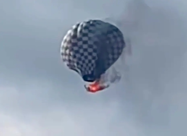 En las imágenes también se puede observar cómo el globo comienza a perder altura, mientras una persona pende de la canastilla con una cuerda, hasta que finalmente cae en un terreno alejado de zonas habitadas.