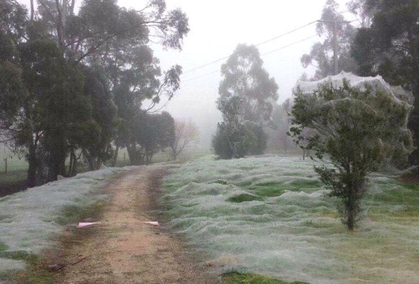 Canberra, Australia, Oceanía.- Cada año, entre abril y mayo, las redes sociales en Australia se llenan de paisajes blancos, los cuales parecen nevados pero en realidad no lo son: se trata de toneladas de telarañas que caen en los campos del sur de la isla continente.