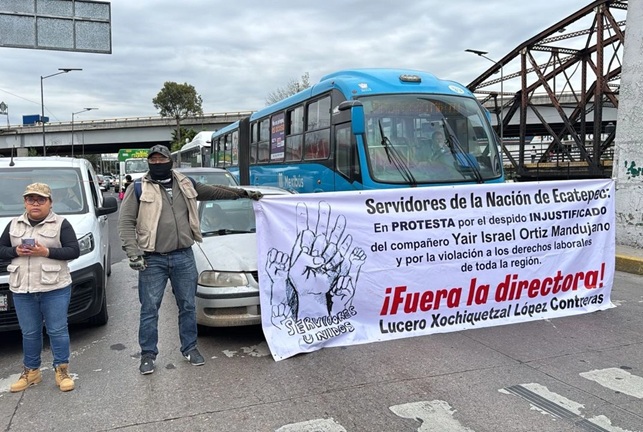 Ecatepec, Zona Metropolitana CDMX, México, América.- Un grupo de trabajadores de la Secretaría del Bienestar, región Ecatepec, bloquearon la vía Morelos para exigir la destitución de la directora regional, Lucero Xochiquetzal López Contreras, por presuntos actos de corrupción y demandar la reinstalación de un trabajador de nombre Jair Ortiz Mandujano, quien presuntamente fue dado de baja injustificadamente.