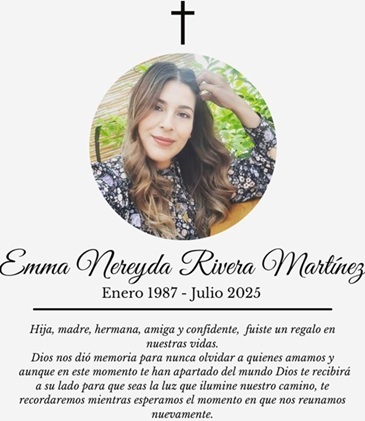 Ciudad Victoria, Tamaulipas, México, América.- La familia de Emma Nereyda Rivera Martínez, quien fuera funcionaria pública del Estado de Tamaulipas, confirmó su muerte a través de un comunicado. En este mensaje; invitan a familiares y amigos a acompañarlos durante el velorio y la sepultura de la exfuncionaria, quien no solo fue una figura pública, sino también madre, hermana y amiga para muchos.