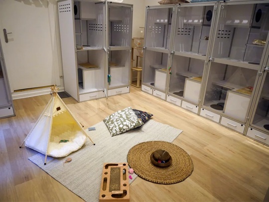 Los espacios también han sido diseñados para ser completamente desinfectados entre estancias, un punto crucial para evitar el estrés relacionado con los olores extraños. Para que los animales puedan moverse libremente, también se ha creado una zona común equipada con árboles para gatos, túneles y otros escondites. Y según Delphine Gilbert, la convivencia siempre ha sido fluida. «El pasado diciembre, durante las vacaciones de Navidad, recibimos hasta doce gatos a la vez, sin peleas».