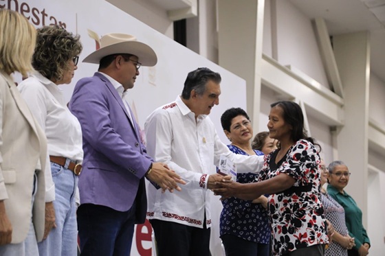 Durante la entrega simbólica a 30 de las dos mil beneficiarias presentes, acompañado por Luis Lauro Reyes Rodríguez, delegado de Programas Federales para el Desarrollo en Tamaulipas, y de Silvia Casas González, secretaria de Bienestar Social, el gobernador mencionó que, tal como lo ha señalado la presidenta, este apoyo es un reconocimiento a la contribución que durante muchos años han tenido las mujeres como protectoras de la familia y protectoras de los valores más valiosos de la formación e integración de la sociedad.