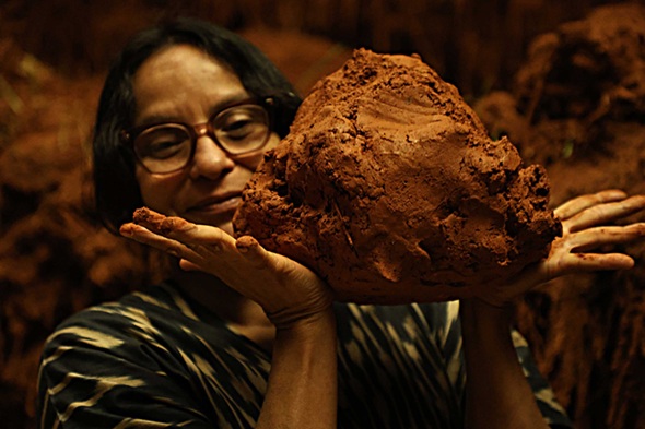 Delcy Morelos lleva un tiempo investigando distintas relaciones con la tierra, el alimento, la magia y mitologías que han cambiado sus concepciones sobre las relaciones sociales y con la naturaleza. Para ella, como para muchos pueblos originarios, la tierra es un ente femenino, sobre todo en relación con la fertilidad y la alimentación; lo que han hecho históricamente los seres humanos es generar tecnologías que les permiten establecer relaciones con esa entidad. Estas técnicas de alimentación no dependen sólo de formas de producción y de consumo, sino que se sustentan en relaciones posibles entre lo divino, lo mágico, lo natural y lo social.