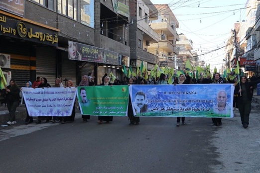 Ayn Issa, Rojava, Asia.- Al margen de una marcha de mujeres en la ciudad de Hasaka, en el cantón de Jazira, las mujeres expresaron su rechazo al aislamiento continuo impuesto al líder Abdullah Ocalan, a pesar de su llamado a la paz y una sociedad democrática emitido el 27 de febrero. Exigieron garantías para su libertad física.